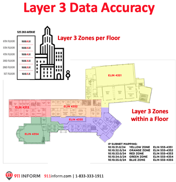 As it turns out, using a subnet or IP address range to locate a device still leaves an unacceptable amount of location ambiguity. They may provide enough detail to isolate a general area, but even that becomes a data management issue. Subnets often span multiple floors and even various buildings. They may be service-specific for an application and physically extend beyond a specific area making the location information unreliable for emergency location reporting.