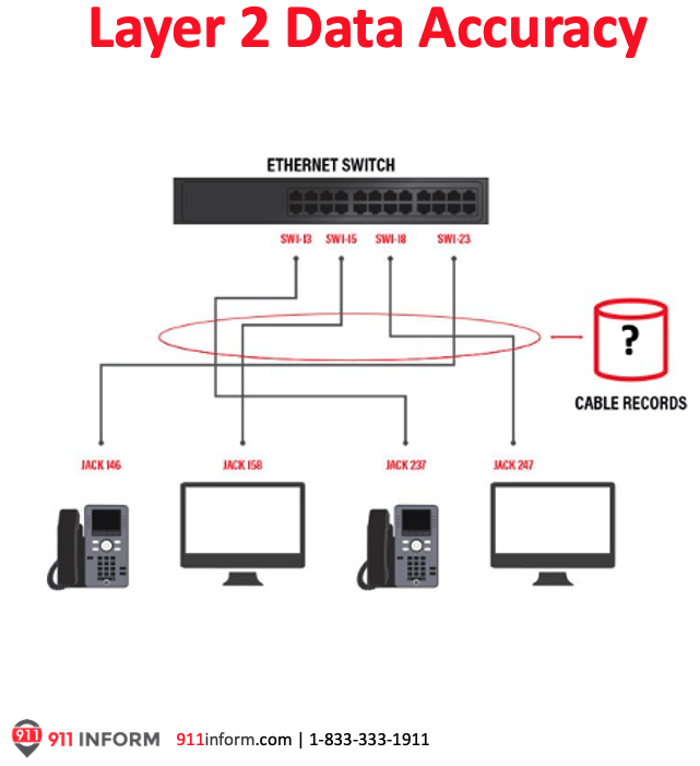 Another solution to obtain better accuracy is to utilize ‘data switch port mapping,’ also referred to as Layer 2 mapping. The issue here is that the data switch port information does not indicate the actual device location without an accurate cable record database. Furthermore, any patch cable moves in the IDF closet corrupt those cable records, and the fact that a cable record database in the enterprise is as tricky to find as a black cat in a coal cellar.