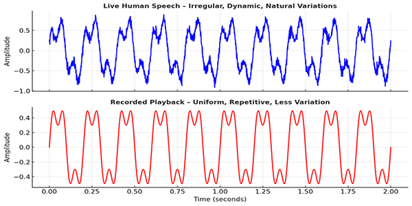 Computers can spot repeated patterns, unnatural silence gaps, and reverb artifacts that give away playback from a speaker or file.